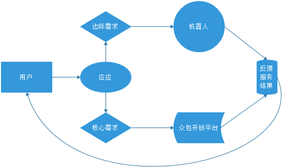 目前他们与用户的普通交流基本是由“聊天机器人”完成,当涉及到一些具体的需求时,再切换到人工方式解决。他们计划未来的大部分闲聊及一些零散的边际需求交给“机器人”完成,那些核心需求采用“众包”的方案外包出去,做一个服务开放平台。如下图: