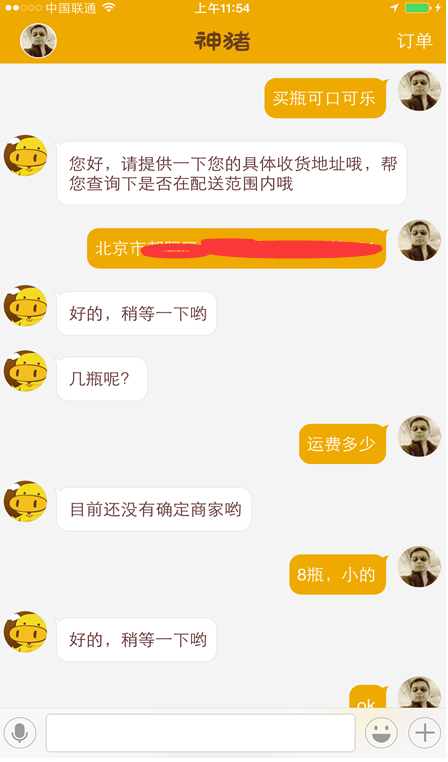 神猪,最近这家公司在国内媒体曝光度挺高,去年7月份创建,也是类似于Magic模式复制版本,不过其客户端不是短信形式,而是采取APP的方式接触用户。他们的服务范围也挺广,标准与非标准的都有。目前他们的服务似乎都由人工完成,我也体验了一把。但是他们的客服体验在时间响应上似乎慢了点,不过态度很好,体验还OK。如下图: