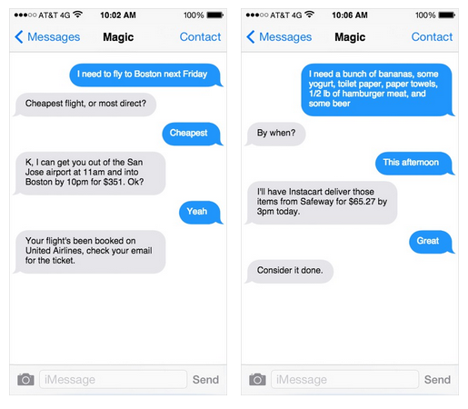 Magic,此类模式的标杆词企业,在2015年3月份的YC DEMO DAY路演中一炮走红,拿到了红杉资本领投的1200万美元,并且估值4000万美元。这家公司认为,短信是最佳的用户体验服务解决途径,因此他们目前主要使用短信作为接触用户的渠道。它们宣称,用户只要把自己的任意的在法律范围内的需求,发给它们,它们都会解决。类似下图的对话形式: