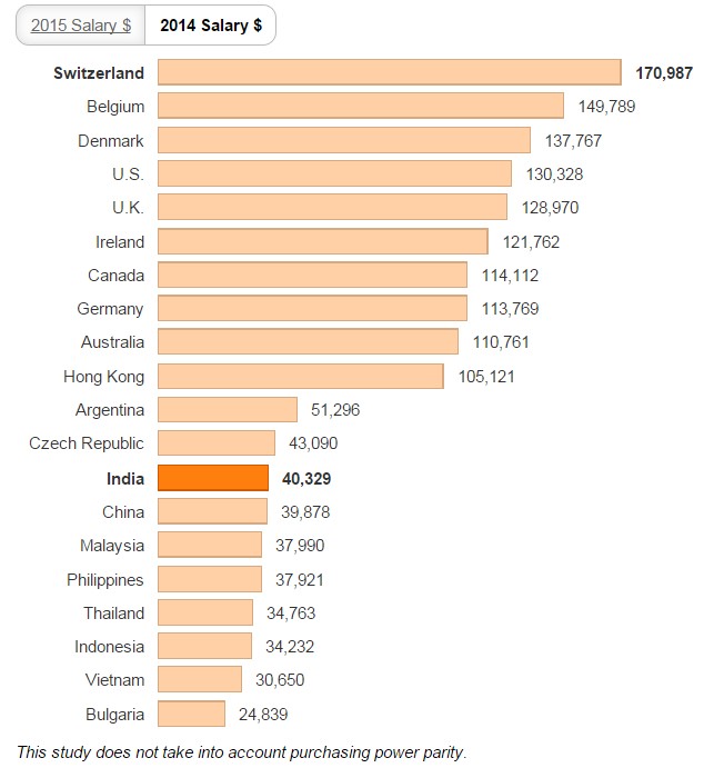 在印度,这个层次的岗位平均年薪是41213美元,在中国是42689美元 ,而在美国则是132877美元(美国在IT行业内是排名第四的高薪)。在所有受访的9413家企业中,位于菲律宾、印度尼西亚和马来西亚的企业薪资排名比印度低,最低薪金的企业出现在泰国、越南和保加利亚。这项调查是通过向各公司人力资源经理咨询公司薪金表所得出的。