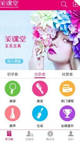 课程设置上 “美课堂”课程内容包括:美容、美发、化妆、美甲等专业技术课程,美业店面的经营与管理课程,企业文化建设、团队建设、业绩提升课程,最新行业资讯、流行时尚风潮、名人名家工作坊等资讯课程。其中仅有美发、化妆、美甲有视频内容展示。在项目计划涉及的店务、经管教学领域,所匹配的相关功能:形象设计、个人成长、业绩倍增、团队建设、名师推荐、秀场,有点击入口,但都无法使用。