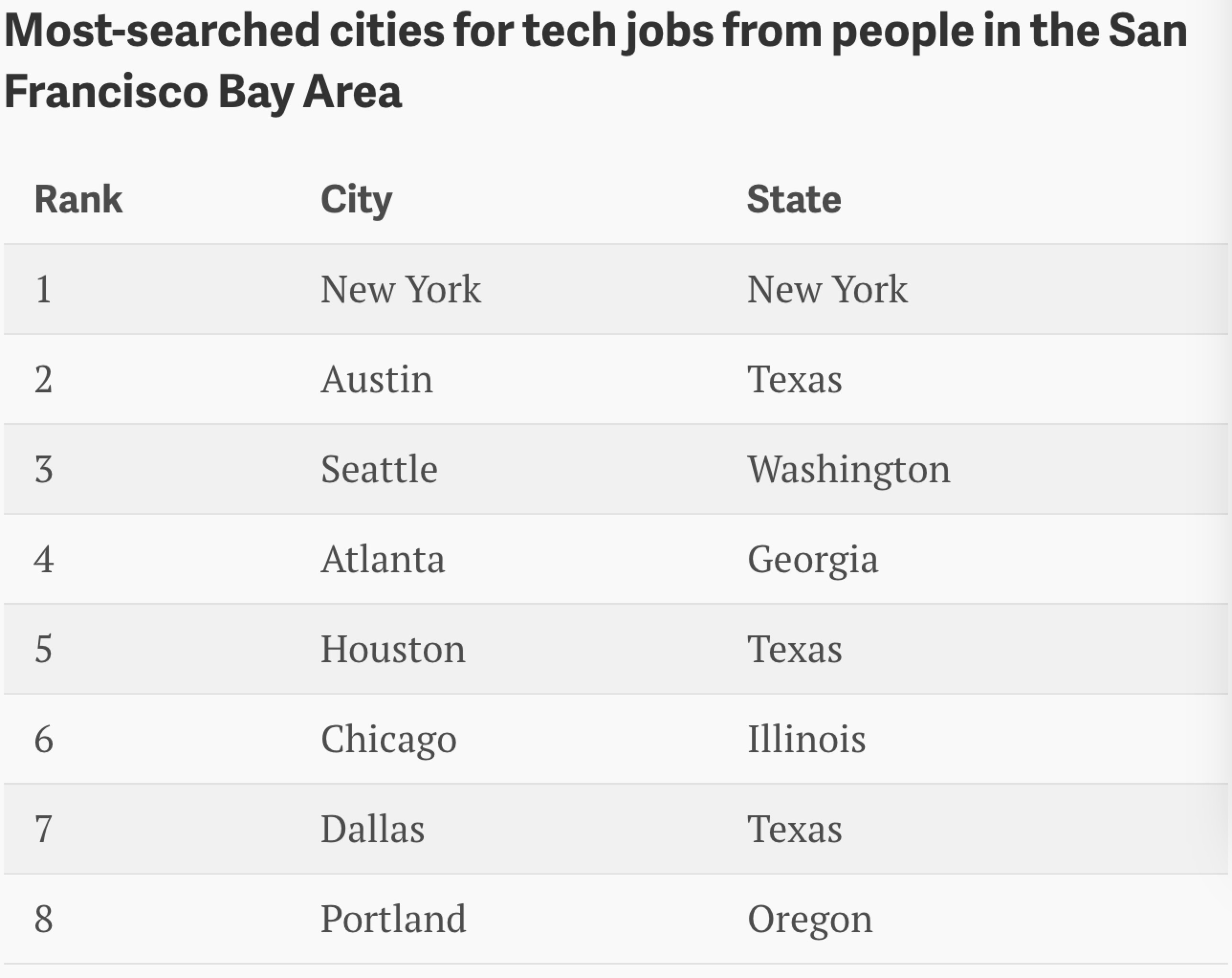 旧金山湾区有着全美最贵的房租。在寻找湾区以外工作机会的人中,年龄在31岁到40岁之间的工作者比例最大,这意味着人们想要在别的地方找到更好的发展机会,在一个更便宜的地区安定下来改善生活质量。