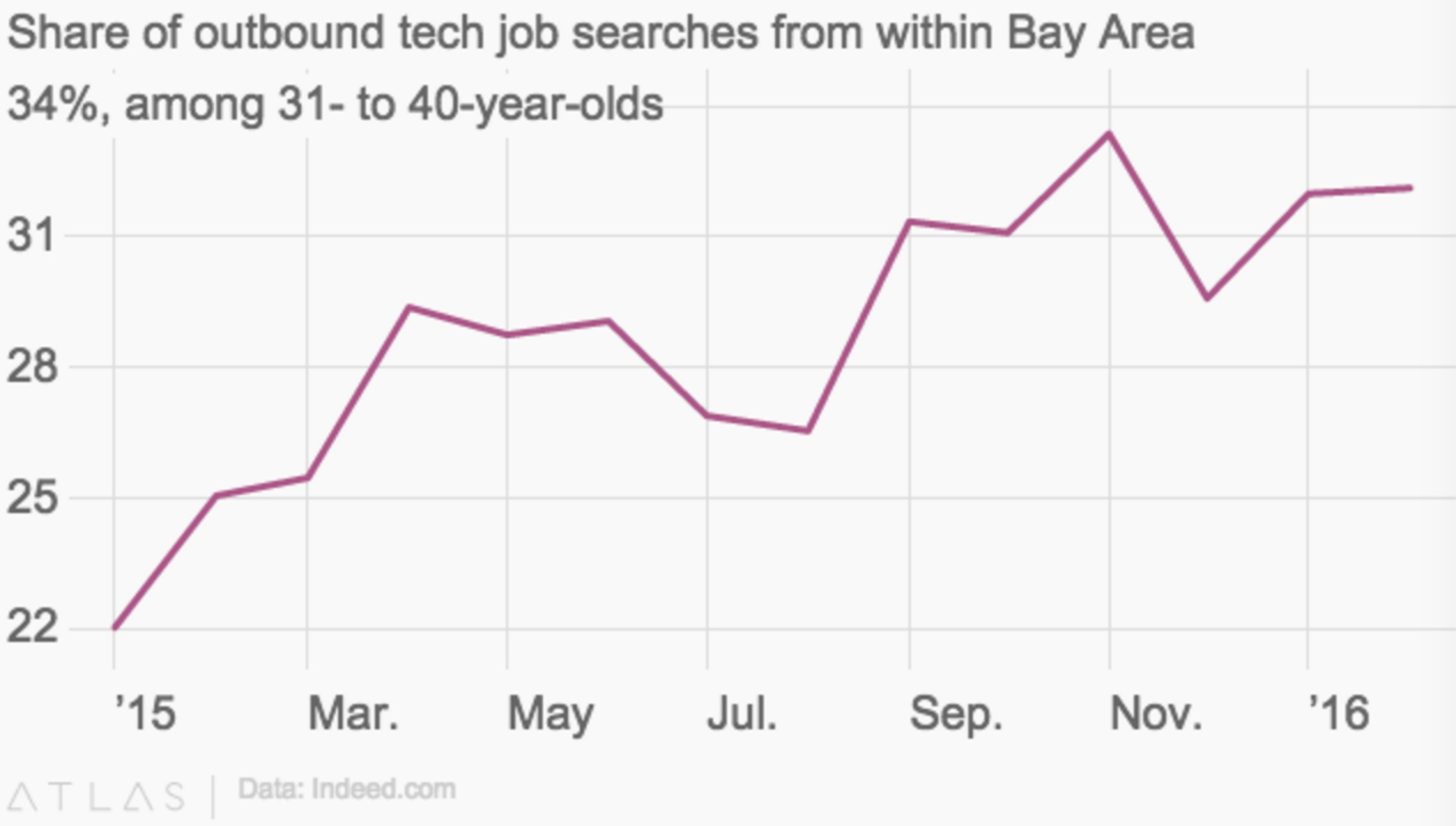 Indeed.com从数据中发现,旧金山湾区内的人们越来越多地搜索湾区之外的工作,到今年二月一号,Indeed.com上35%的该地区的科技工作者都在寻找其他地区的工作。这一数据取的是30天的平均数并对一些季节性因素做了调整,比去年同期增长了近30%。