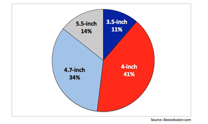 这种变化早已发生,不妨对比一下2014年9月发布iPhone 6和6 Plus之前和苹果最新一个季度的营收表现。如图二所示,2014年9月初的时候,iPhone的用户群主要是两类人:3.5英寸屏幕用户(也就是用着4s、4和3GS的人)和4英寸屏幕用户(5s、5c和5)。