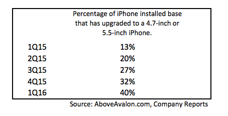 图四:从2015Q1到2016Q1,换成大屏6代iPhone的用户比例一直没有过半。