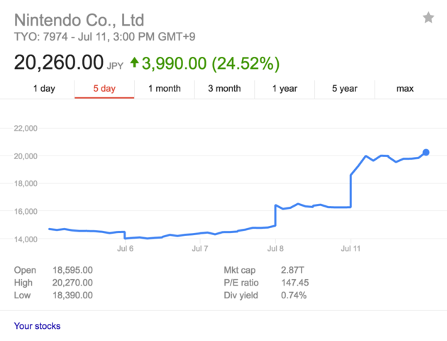 游戏的合作开发公司是Pokémon Company,由任天堂公司控股。从7月6号游戏上线开始的五天内,任天堂的股价上涨了近50%。