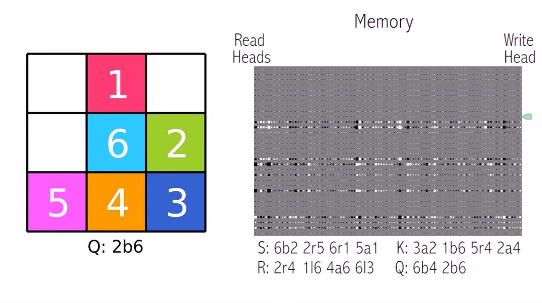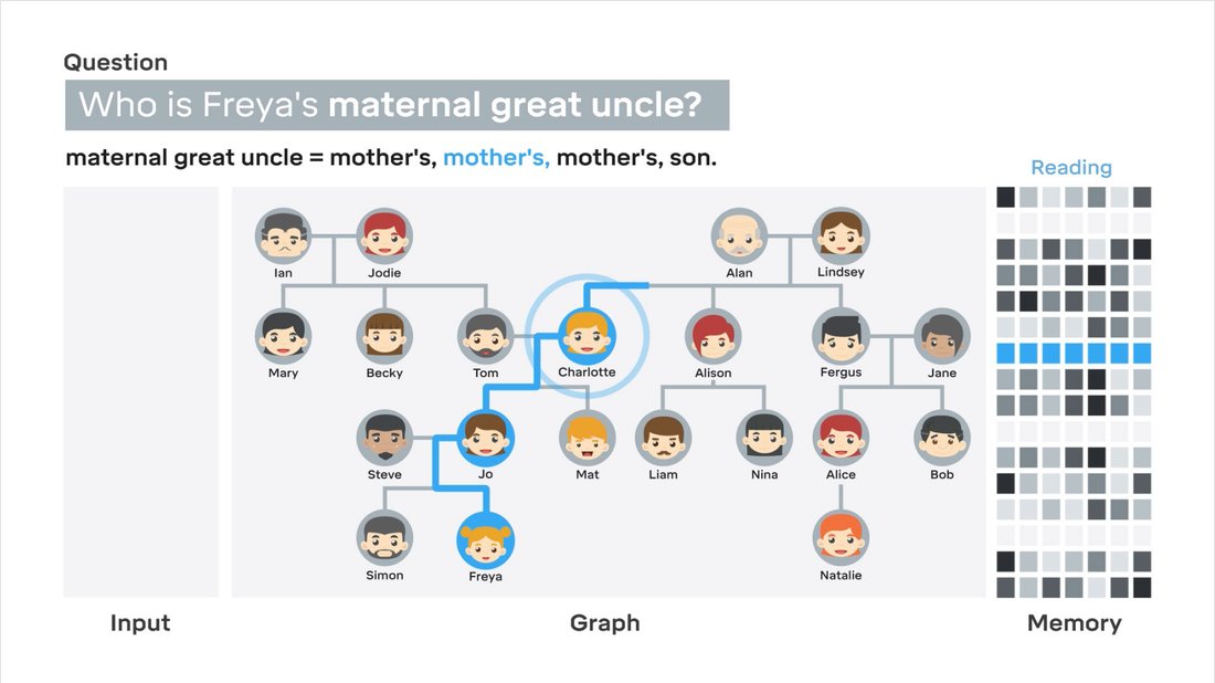 利用一份家谱,我们展示了DNC可以回答需要做复杂运算的问题。比方说,即使我们仅提供了父母、孩子以及兄弟姐妹之间的信息,也可以问DNC“谁是Freya妈妈那边的叔父?”现在我们可以看到controller读取的是哪个记忆区间的信息,以此分析DNC如何使用其记忆。和DNC相比,之前传统神经网络要么没法存储信息,要么就是不会学习解读数据,举一反三。
