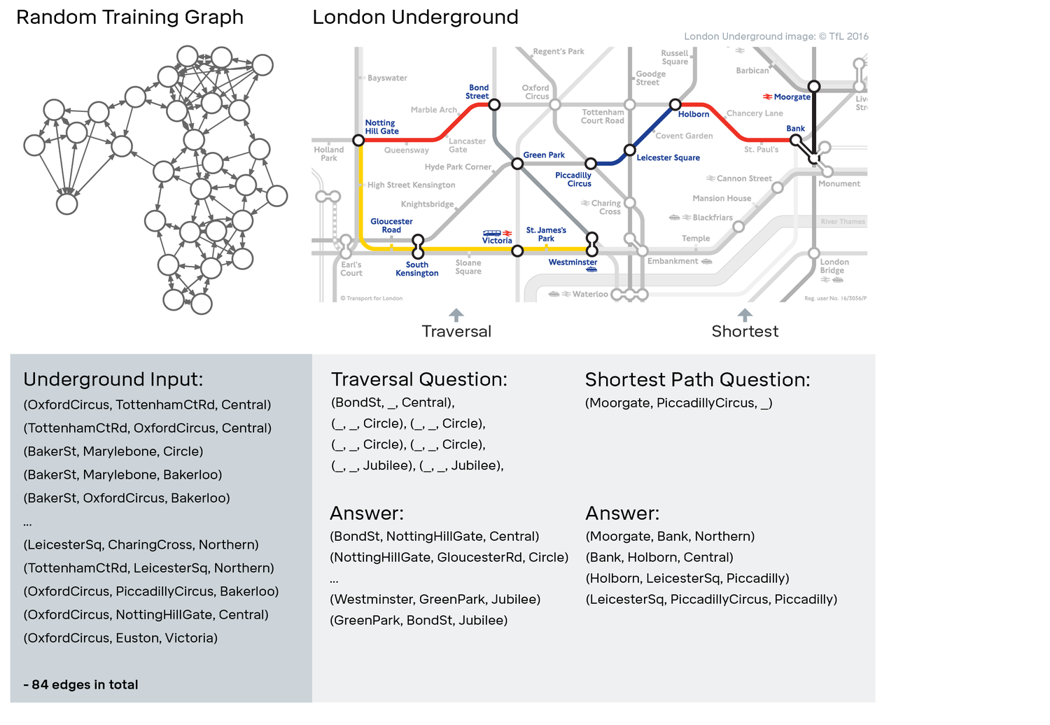DNC在接受训练时使用的是随意生成的图表(左)。训练以后,我们再测试DNC能否在伦敦地铁图中找到合适的路线(右)。我们用多组三个词来描述地铁图,并用两个任务来举例:“横向往返运动”,即DNC从站点开始,按一定顺序的路线行走;“最短路线”,也就是DNC要找到两个站点之间最短的线路。