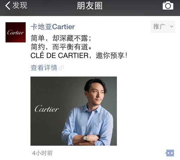 于是,我们接着看到了香奈儿(Chanel)将在北京举行的“巴黎在罗马”高级手工坊大秀的嘉宾邀请、秀服展示、商品购买都放在了微信上;卡地亚(Cartier)和蒂凡尼(Tiffany) 孜孜不倦地在朋友圈和 QQ 音乐开机屏投放广告;珑骧(Longchamp)还为时尚杂志编辑以及艺人经纪人提供了借取样衣的微信公众号。