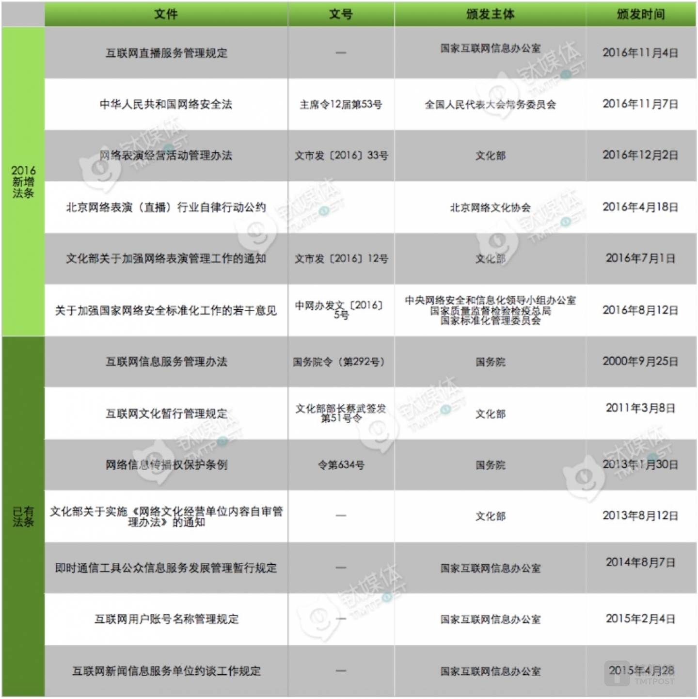 经钛媒体统计,仅2016年一年相关部门就先后出台了6部相关政策和法条。加上已有的互联网信息传播领域的政策法规,做一个直播平台要面临来自国务院、文化部、国家互联网信息办公室等多家不同层级过机构、13部大小法条的监管。