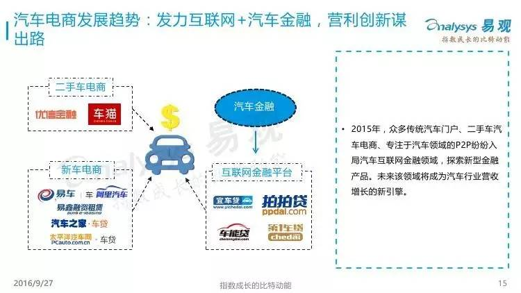 归其原因,一来如新华信的研究报告所言,新车的整车销售都不再是利润高点,4s经销商都赚不到什么钱,加上线上的流量成本,汽车电商的确有点名不副实;二来渠道和入口确实有了,但消费场景化仍显割裂,无论是直接导流,还是O2O或者B2C的模式,线上线下并没有实现一体化;再者汽车厂商与4s店的利益捆绑关系,让从中杀入的第三方角色稍显尴尬。汽车电商之路基本搁浅,切入汽车金融只好另寻出路。