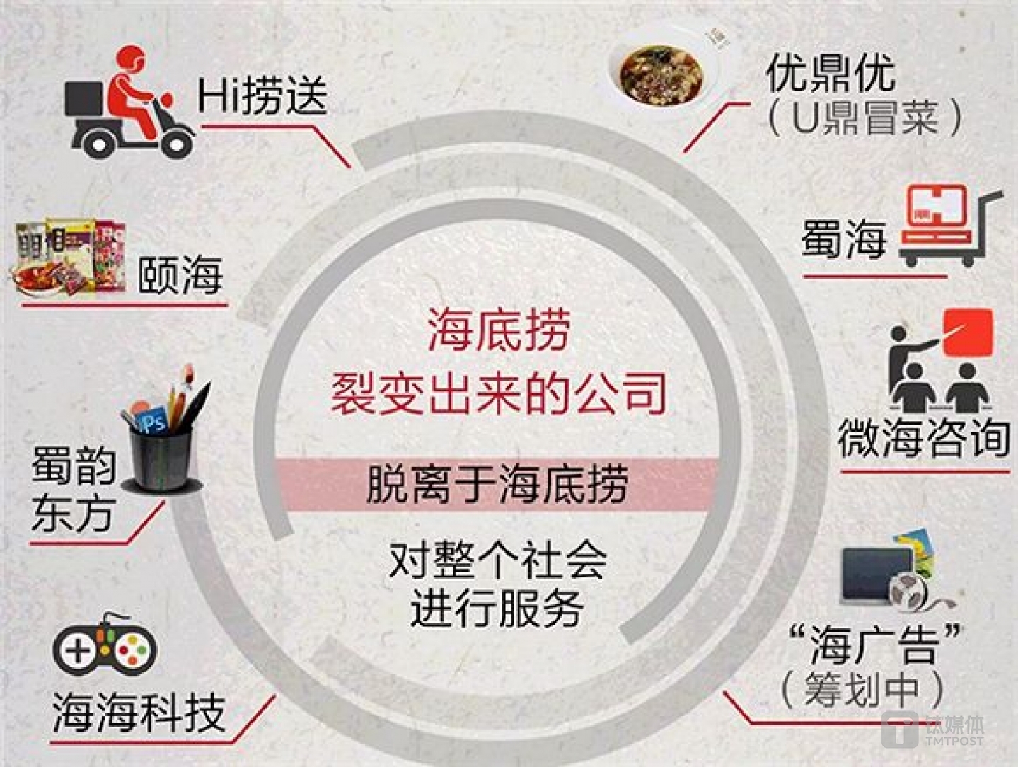 以“海底捞”为例,它旗下的物流、供应链、品牌宣传已经成立了单独的公司来做,自然不会需要第三方供应商来插足。