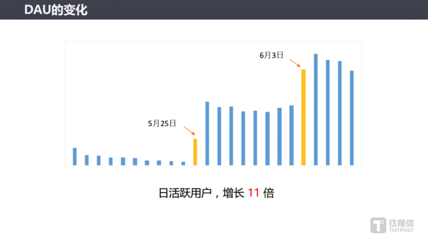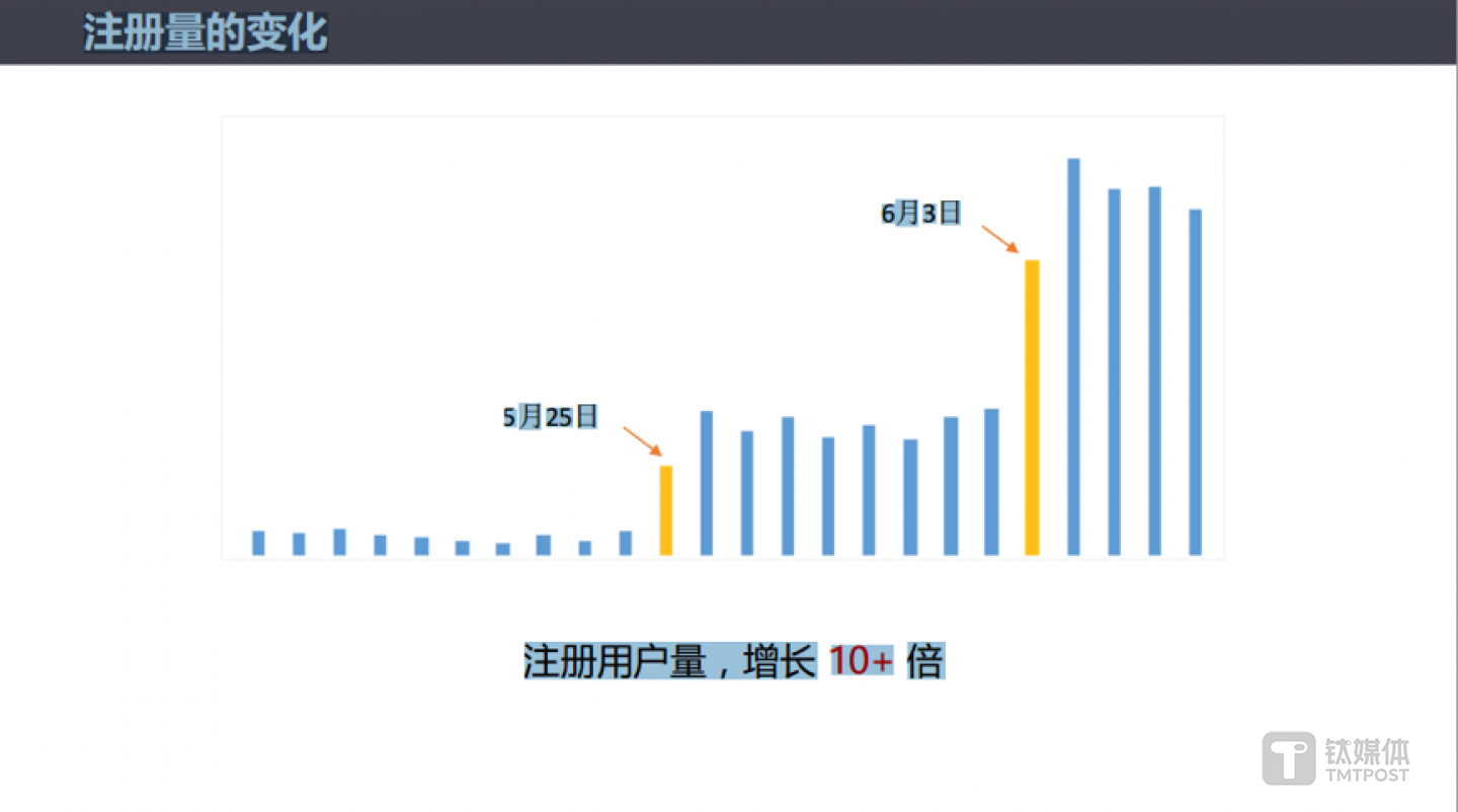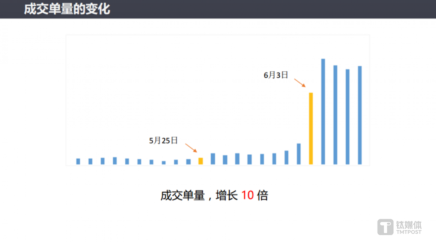 在当天的案例演示中,刘进提供了三张用户活跃度表格,分别是注册用户量、日活跃用户与成交单量,可以看到柱状图中,5 月 25 日与 6 月3 日的起伏较大。
