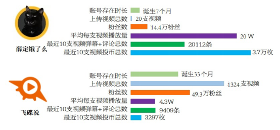 从B站“原创科普节目”中,老牌科普栏目《飞碟说》绝对数据量大,而从平均每个视频的相对活跃度来看,《薛定饿了么》有望成为新生代中的现象级知识型UP主(视频上传贡献方)。