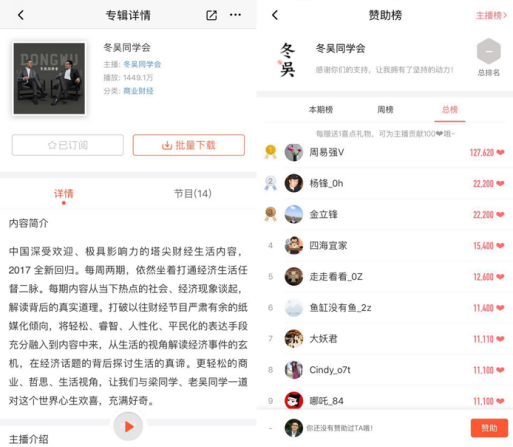 可喜的是,最近新推出的一些好内容不做付费订阅,如《冬吴相对论》自6月初复播改名为更年轻化的《冬吴同学会》,目前14期节目在喜马拉雅累计收听量达1449.1万,而笔者在打赏中总榜中发现,超1000元打赏费的粉丝有50人,打赏超1万元以上有9人,最高打赏者费用12.7万元,平均每期百万级的播放量,后期引入贴片广告或前段播音广告,盈利模式依然相当可观。