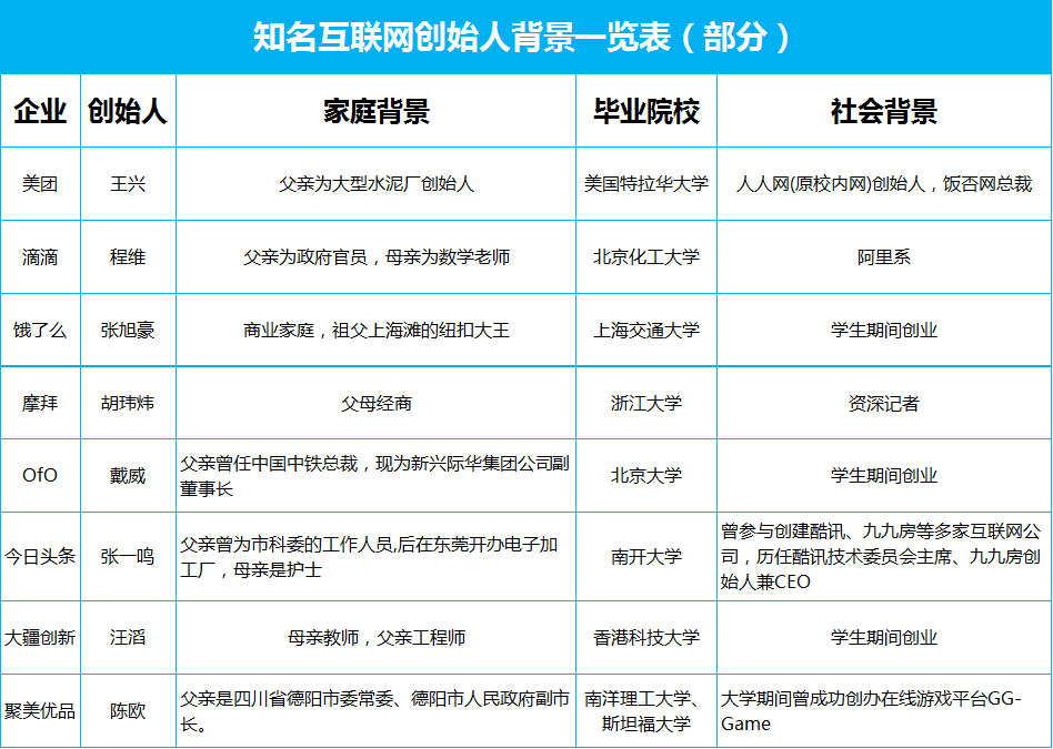 一个不争的事实是,在雷军刘强东之后,当下创业成功的一波知名独角兽创业公司里,已经很难找到草根的影子。绝大多数的创始人,他们大多出生在富裕或者高知高干家庭。家庭出身不是他们成功的唯一要素。但不可否认的是,出身提升了他们成功的概率。