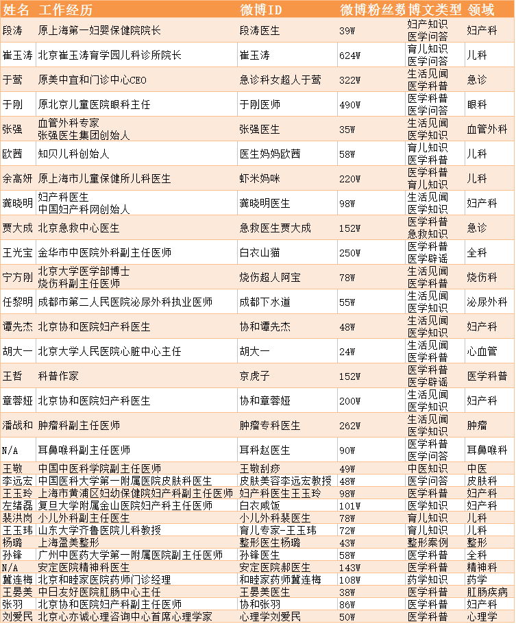 医疗大V圈是个讲“出身”的地方,新浪微博医疗频道1200多个认证专家里边,有1/4挂着协和医院或者曾经挂着协和医院的认证;另外一些,多是靠发锥子脸、气垫胸吸引关注的营销号;再剩下点中医养生和针灸推拿博主,粉丝也不到100W人。