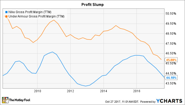 可以看到,Nike的毛利率水平在近几年内始终在UA的下方运行,截至11月1日,Nike毛利率已降至44.10%的水平。所以,Nike才亟需在产品设计和投放,以及在合作零售终端上寻找到更有效率的办法。