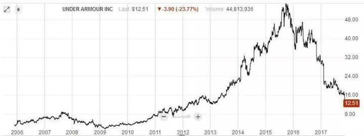 不幸的是,上述利空因素几乎贯穿全年,尤其是对照UA自2005年上市至2015年的辉煌十年来看,今年的下滑更是放大了市场对UA的悲观预期。这也标志着,“连续26个季度超过20%高速增长”的UA神话终将在2017年迎来尾声。