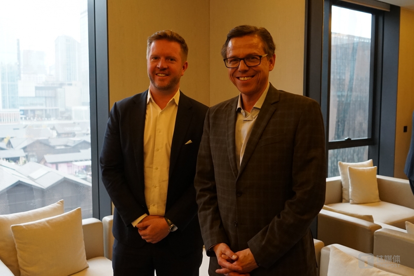 图为宝马中国出行战略总监潘鼎乔先生 Joe Pattinson(左)&宝马集团出行及能源服务全球副总裁 Dr. Bernhard Blättel(右)接受钛媒体采访