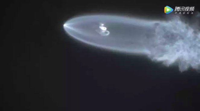 此外,猎鹰二级使用了真空版梅林发动机,加大了喷管尺寸,点火时,尾焰要更大一些。不过视频中二级火箭点火后,锥形尾焰更加粗壮的主要原因是因为此时火箭已经有了飞了很高,这个高度的大气密度已经很低,所以水蒸气的扩散速度更快,因此产生的视觉效果就会更震撼。如果大家非常仔细的看这段的视频,会发现一个小细节。在锥形尾焰有一个亮点,在它的照射下,很明显有一圈一圈的烟在飘动,这又是什么?![]()