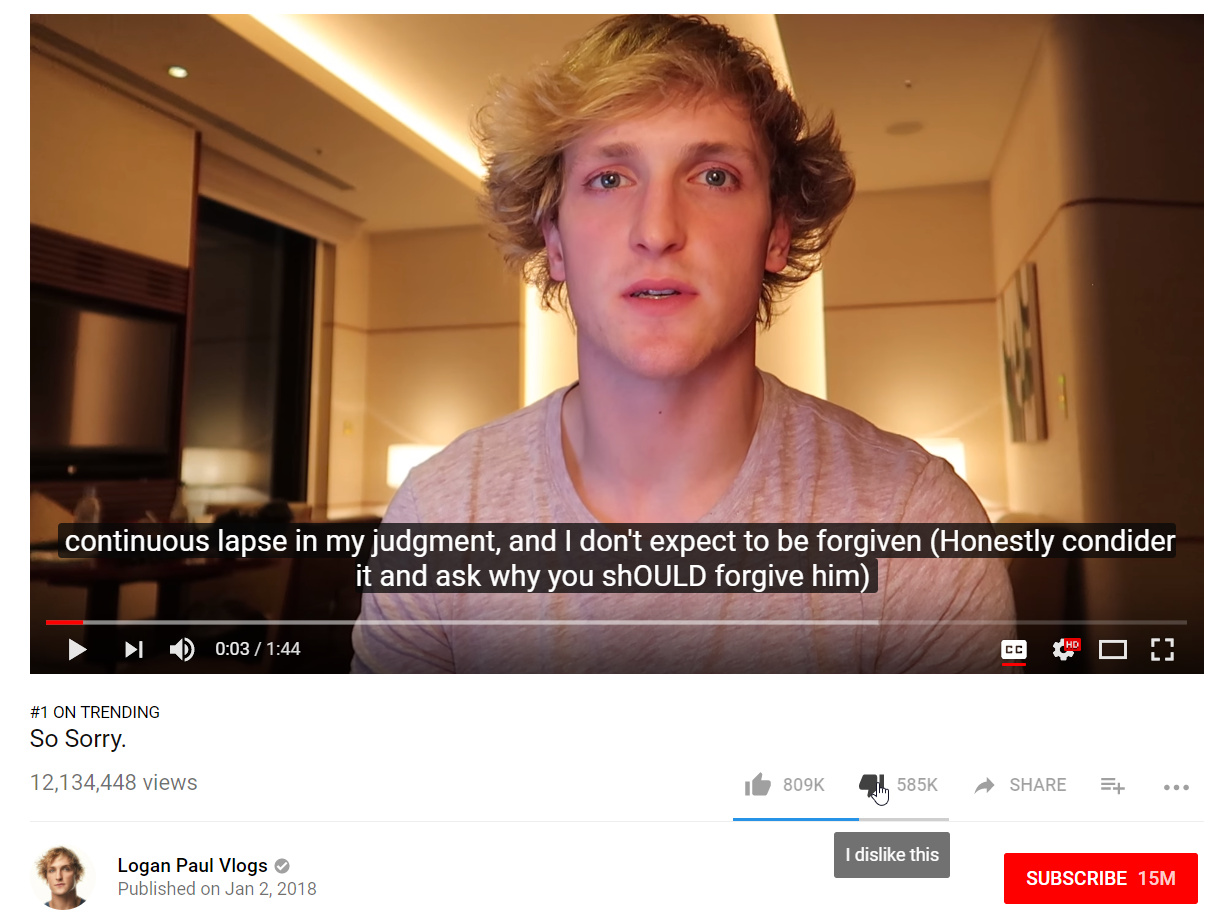 就算这名已经被互联网上的道德伦理审判群起攻击的被告只有22岁,扮演着法官、原告和陪审团们的人们也不会轻易放弃这个重塑既有道德准则的机会。面对人们的批评和退订的威胁,罗根最先意识到了问题的严重性,他迅速撤下了视频并在 Twitter 上放出了致歉信,同时还在 YouTube 上发布了道歉视频。
