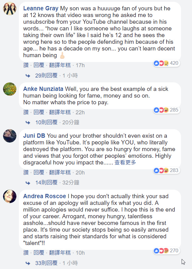 当然,罗根并不是第一个有这种经历的人。成名比他更早名气更大于他的 YouTube 网红 PewDiePie 就在2017年遭遇了遭遇了同样的风波。
