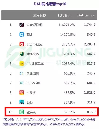 比体量和推荐技术它不如今日头条;比内容质量他也很难超过微信公众号;趣头条唯一让投资人眼前一亮的恐怕就是它的增速了,2017年的DAU同比增长373%,排名第10位。