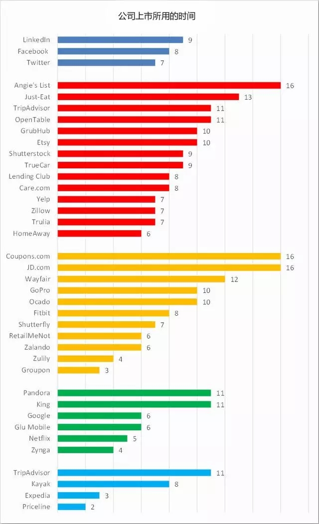由上图可见,一家公司从创立到上市的平均所需时间是8年。2014年聚美优品上市时,只用了4年时间就被媒体大肆吹捧,认为是一个非常少见的成功案例了。到2017年趣店上市时,只用了3年时间,更是让创业者们看到了抱大腿的好处。