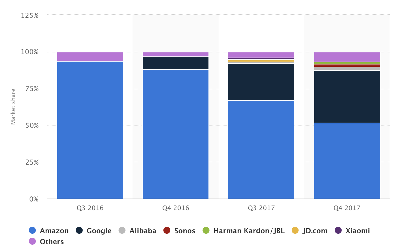然而,风口总是来的很突然。亚马逊之后,谷歌、苹果相继加入了智能音箱大战。但是,整个市场局面如当年的云服务一样,亚马逊已经悄无声息的占领了市场——2016 年,当诸多巨头布局智能音箱时,亚马逊的市场占有率达到了 90% 左右。一年之后,尽管谷歌攻势迅猛,市场迅速增长,但亚马逊仍然占据智能音箱的半壁江山。