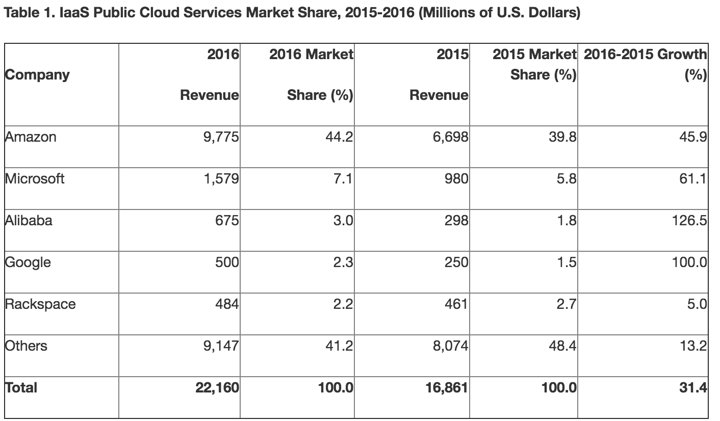 先发制人。当谷歌等科技公司意识到亚马逊云服务产生的威胁时,美国的诸多互联网企业已经都用上了亚马逊的云服务。根据 Gartner 提供的数据,2016 年,亚马逊云服务在全球云市场中占据了 44.2% 的市场份额,是位列第二第三的微软和阿里总和的 4 倍多。亚马逊财报显示,去年第三季度,亚马逊云服务净销售额 45.84 亿美元,同比增加 42%,成为了亚马逊业务增长的核心。