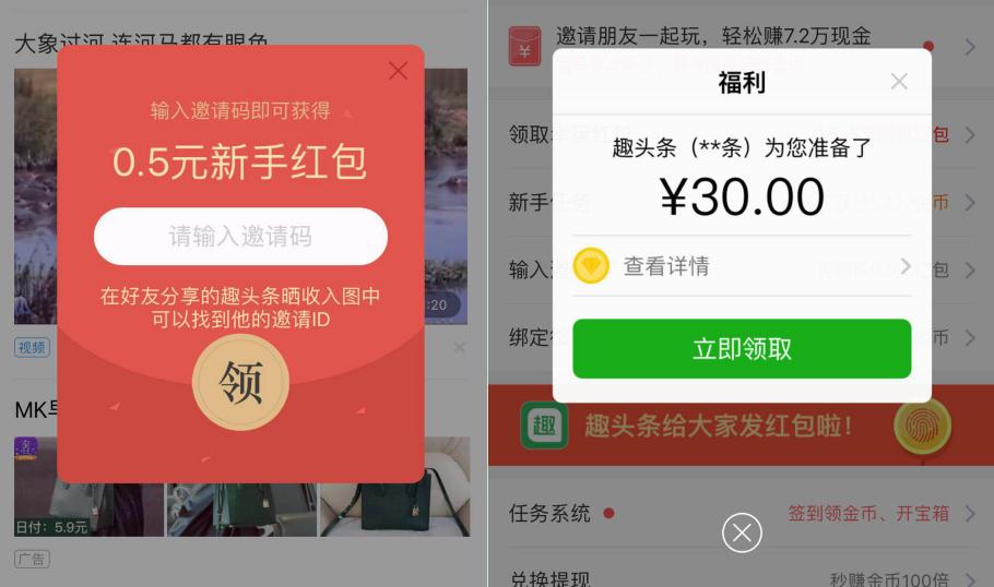 (左图为趣头条唤醒用户短信;右图为分享拉人奖励)