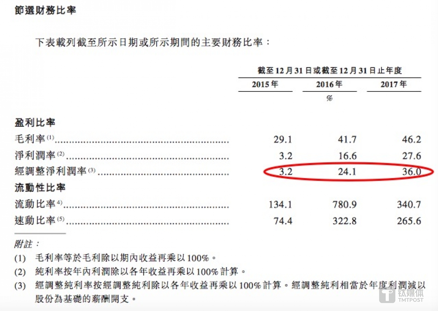 值得注意的是,该公司毛利率从2015年的29.1%一路攀升到2017年的46.2%;2017年公司净利润(即年内利润)达到3.6亿元,是两年前(2015年净利润151万元)的238倍;调整后的净利润率从2015年的3.2%,在2017年达到了36%。