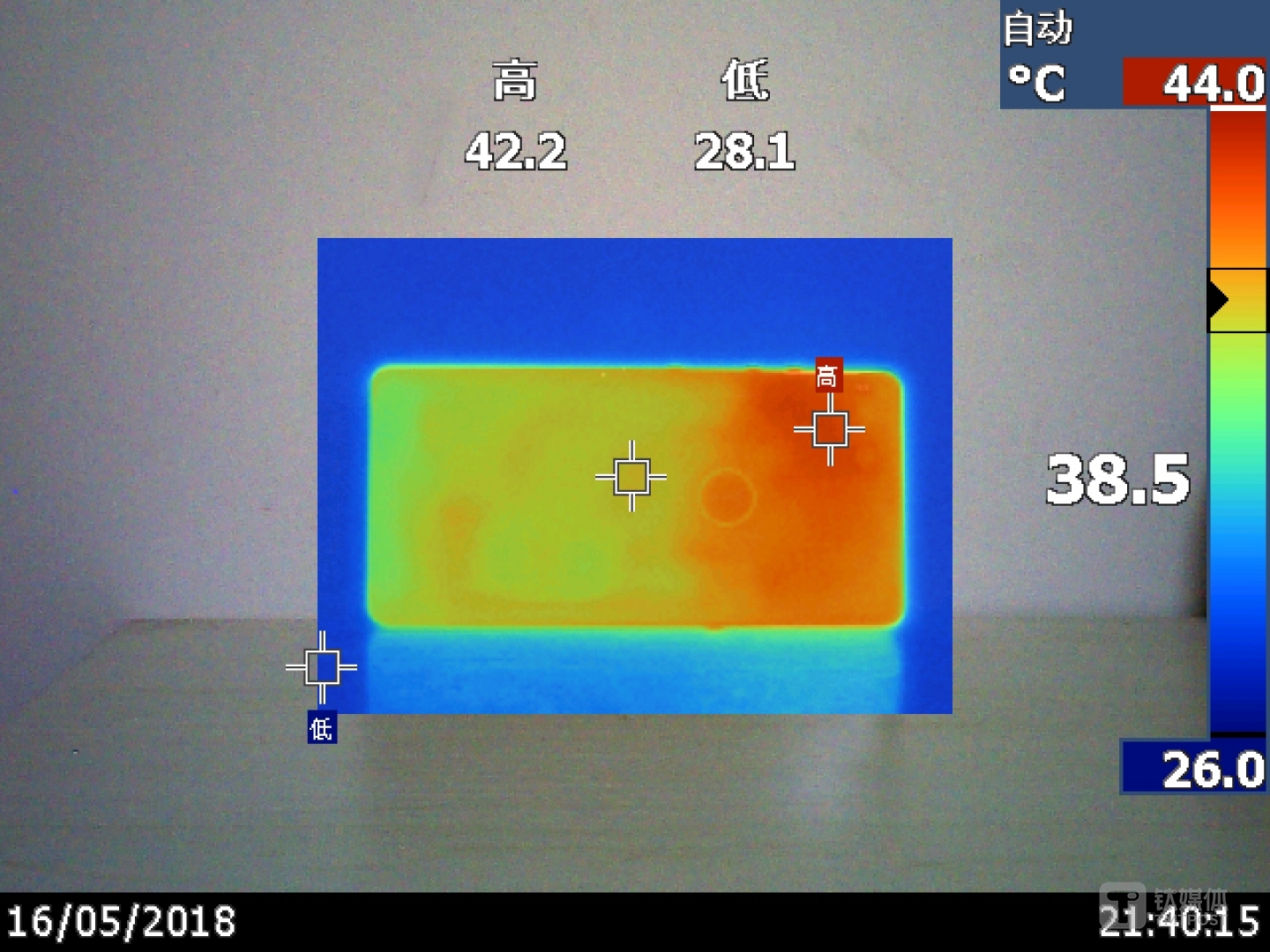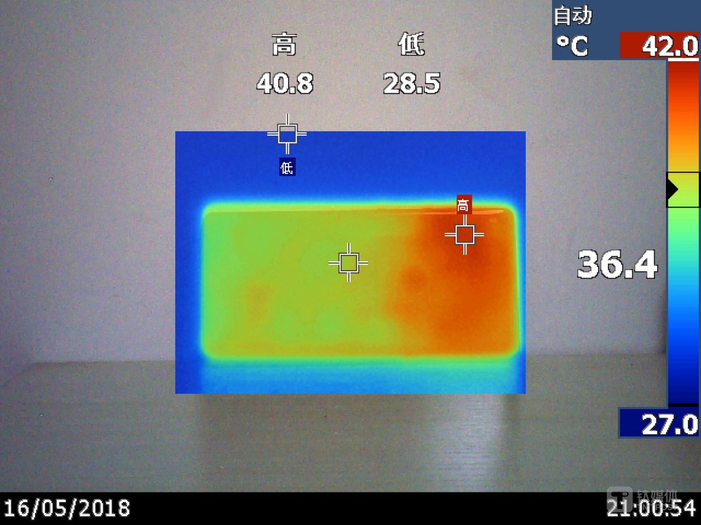 画质全开状态下“吃鸡”两分钟后,坚果R1摄像头位置出现明显升温,最高温度达到40.8°C。