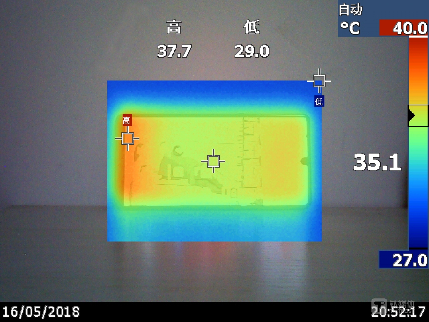 测试开始阶段,笔者将手机唤醒,简单的进行了网页浏览和社交对话,在室内25°C的情况下,拍摄坚果R1手机的温度变化情况。正常操作下,坚果R1的热量分布如上图,最高温度出现在麦克风位置为37.7°C,一部分为硬件发热情况,另一部分也是手握造成短暂升温,平均温度为35.1°C。