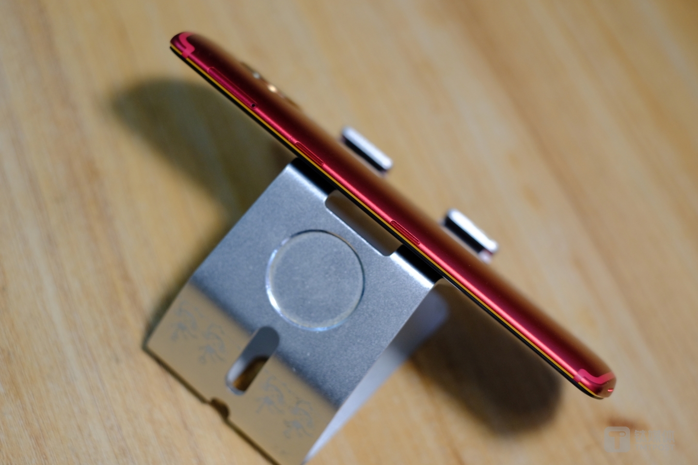 屏幕采用了略微带一点弧度的 2.5D 玻璃,仔细观察可以发现屏幕略微高出边框一圈。笔者手上的这款浆果色手机边框上镀上了一圈金色——浆果色的配色已经是足够吸睛,现在搭配上一圈金色,更显骚气。除了“金边框”,正面面板上的那一对前置双摄和位于手机上部的一对补光灯。自拍的时候,如果光线不足,那么它们会自动亮起,进行补光。