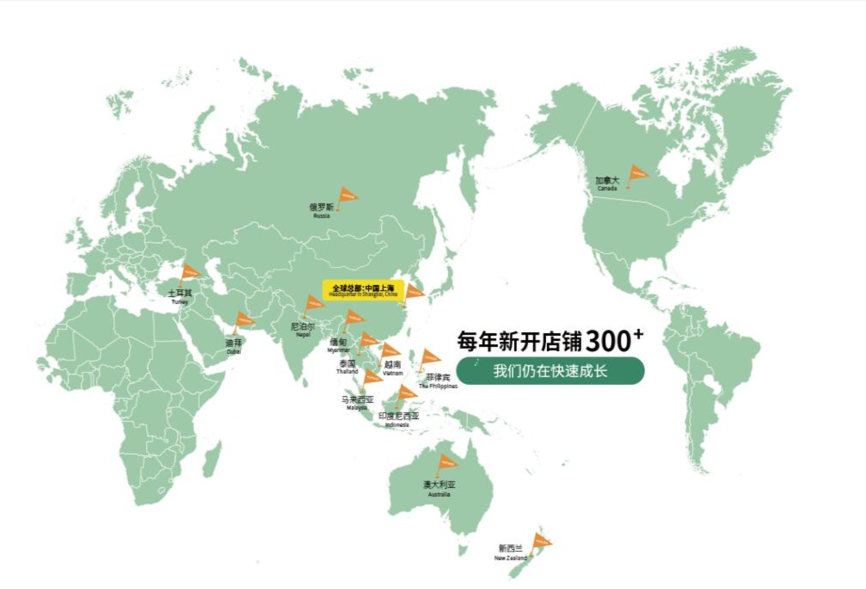 据其网站显示,它已经在东南亚、澳洲、中东、加拿大、俄罗斯等20多个国家和地区开设了门店,预计到2020年,门店数将达到3500家。