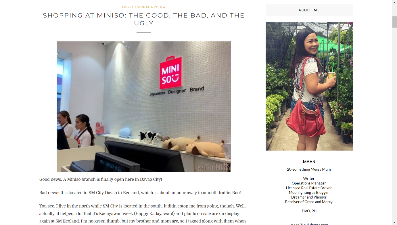 2017年8月,MINISO在达沃市的SM City商场开设了一家门店,她立刻去体验了。她在博文中提到,MINISO比日本的十元店品牌大创Daiso要小,让她有点失望,但是品类更齐全,还可以买到充电宝和、LED灯和蓝牙耳机。