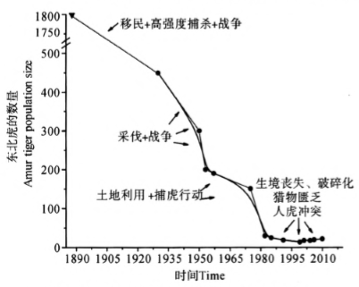 先来看一组数据。1890年,我国野生东北虎的种群数量为1200—2400只,1930年约为450只,40年间减少了75%。到20世纪80年代,我国野生东北虎已基本处于灭绝边缘,仅14只左右,与1930年相比,减少了96%。