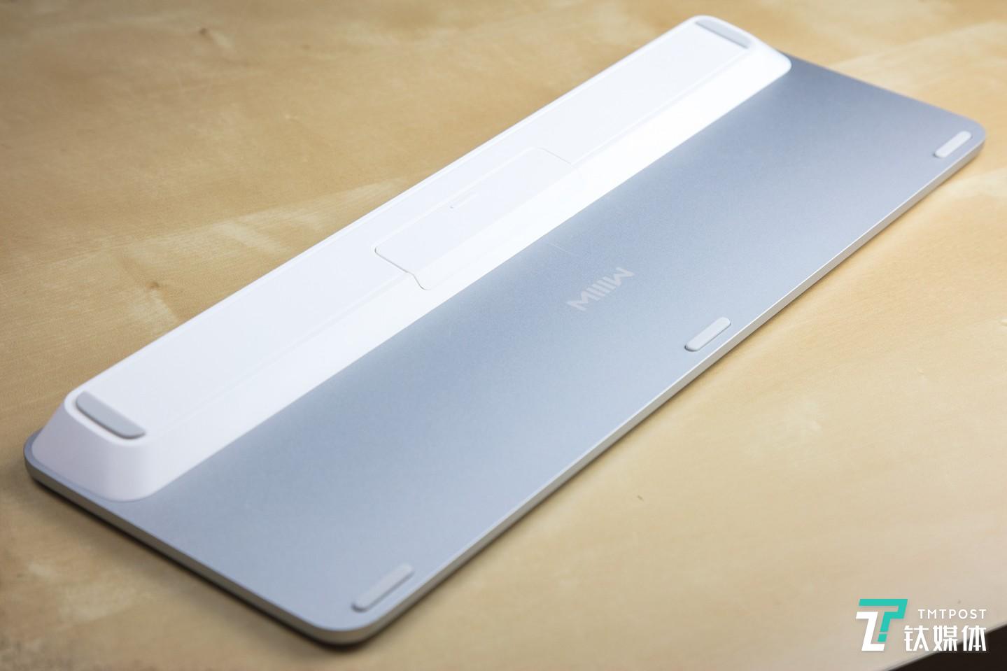 将键盘翻转到背部,其底座采用灰色铝合金,简约的外观,同时也给整个键盘增加了不少厚重感。