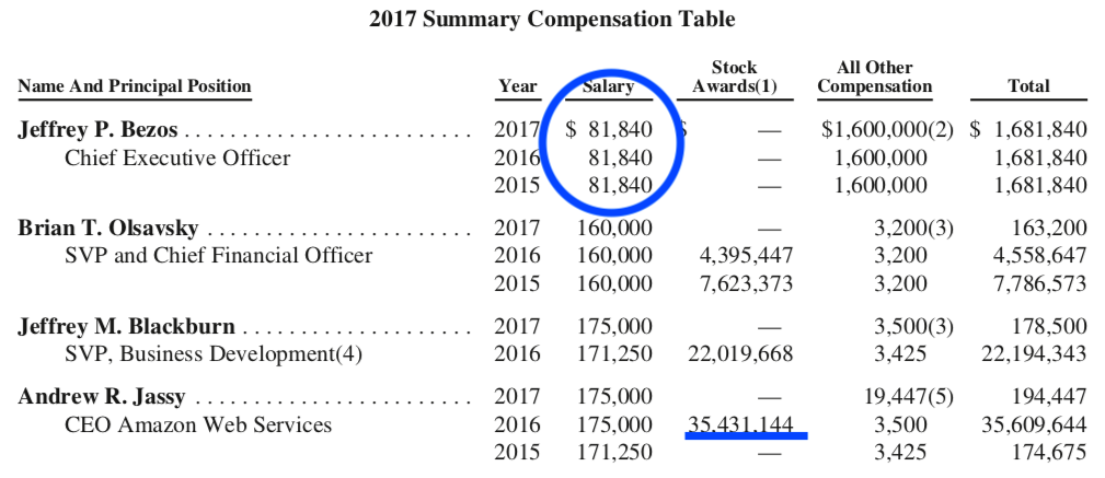 我们还能从这份薪酬表中发现一些隐藏信息,2015-2017这三年中,云计算AWS的CEO Andrew Jassy只有在2016年获得了公司授予的价值3500万美元的股票奖励,这是代表AWS在2016年的业绩特别好,这位CEO功不可没吗?