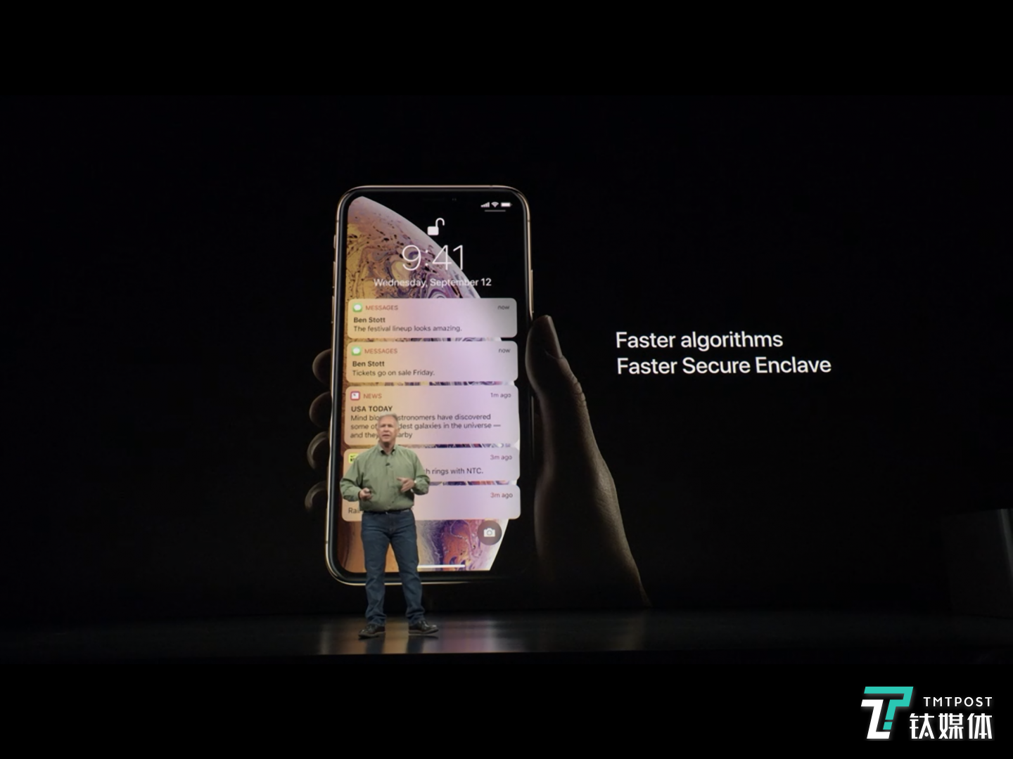 手表介绍完了,终于到了整个发布会的主角新一代 iPhone Xs。关于这一代 iPhone Xs,其实媒体曝光的差不多了。比如外观设计没有太大变化,加入了新配色(金色),性能得到了提升。性能提升成为了介绍这一代产品的重头戏。