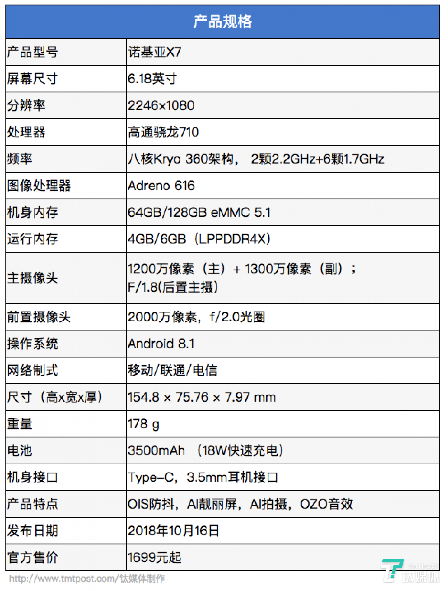 目前,诺基亚X7有4GB+64GB、6+64GB和6GB+128GB三个版本,售价分别为1699元、1999元和2499元。单从硬件配置和售价来看,诺基亚X7成功将高通骁龙710的售价门槛再次压缩,对于消费者来说性价比还是非常不错的。