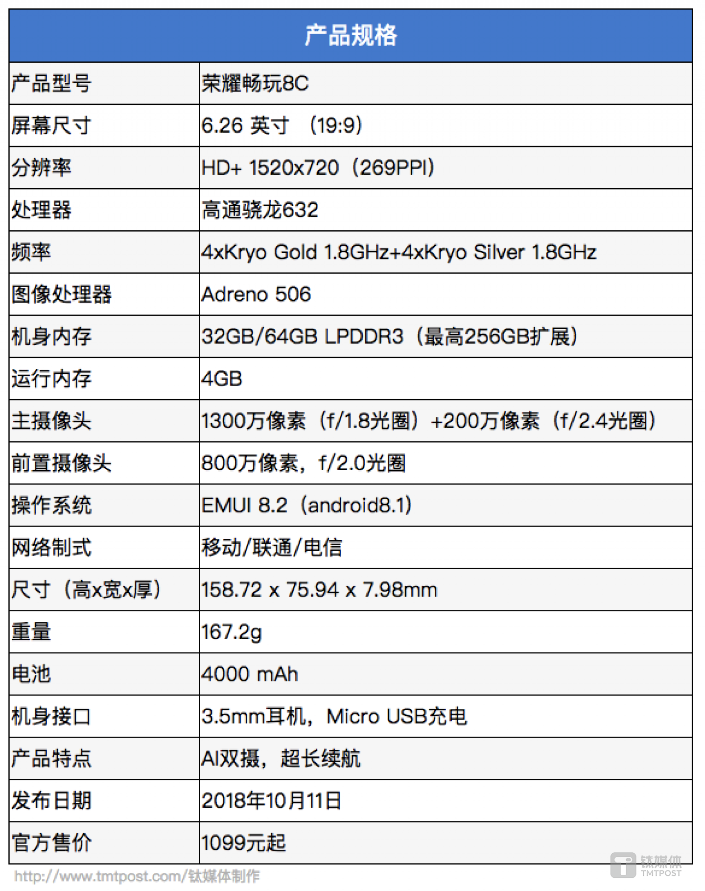 在性能上,荣耀畅玩8C搭载骁龙632芯片,其采用了8核Kryo 250,主频1.8GHz,集成Adreno 506 GPU,X9 LTE基带(Cat.7),下行最高300Mbps。