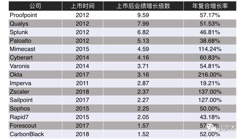 通常的说法是美国的网络安全市场比中国超前三到五年,其实绝大部分网络安全的细分领域都是在五年以上。分析美国2012年左右上市的这批公司,这几年的年复合增长率都在50%到100%之间。2017年、2018年上市的公司有一个特点,即不再是一个综合性的安全公司,而是专注于单一产品,但是增长速度非常快,每年以80%以上甚至100%、200%的速度增长。成立越早的公司,像Symantec、Mimecast,“老三样”占的销售额比较高,相比于成立年头比较短、专注于单一产品的公司来说,增长速度就不一样。