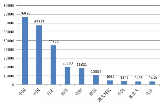 其中,中国以76876件的专利申请数量列于全球首位,高于美国。