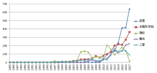 其中三个中国申请人,百度、中国科学院、腾讯的申请量在近几年增长迅速。尤其大家可以注意到,在2016年之后,百度公司的专利申请量陡然提高,迅速超过了其他申请人,并在最近两年遥遥领先。