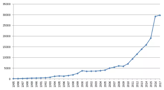 而另一方面,根据德温特世界专利索引(DWPI)数据库资料显示,全球范围内,人工智能领域的专利申请量总体上呈逐年上升趋势,在2010年后增长速度明显加快,近两年的增长率更是令人瞩目。