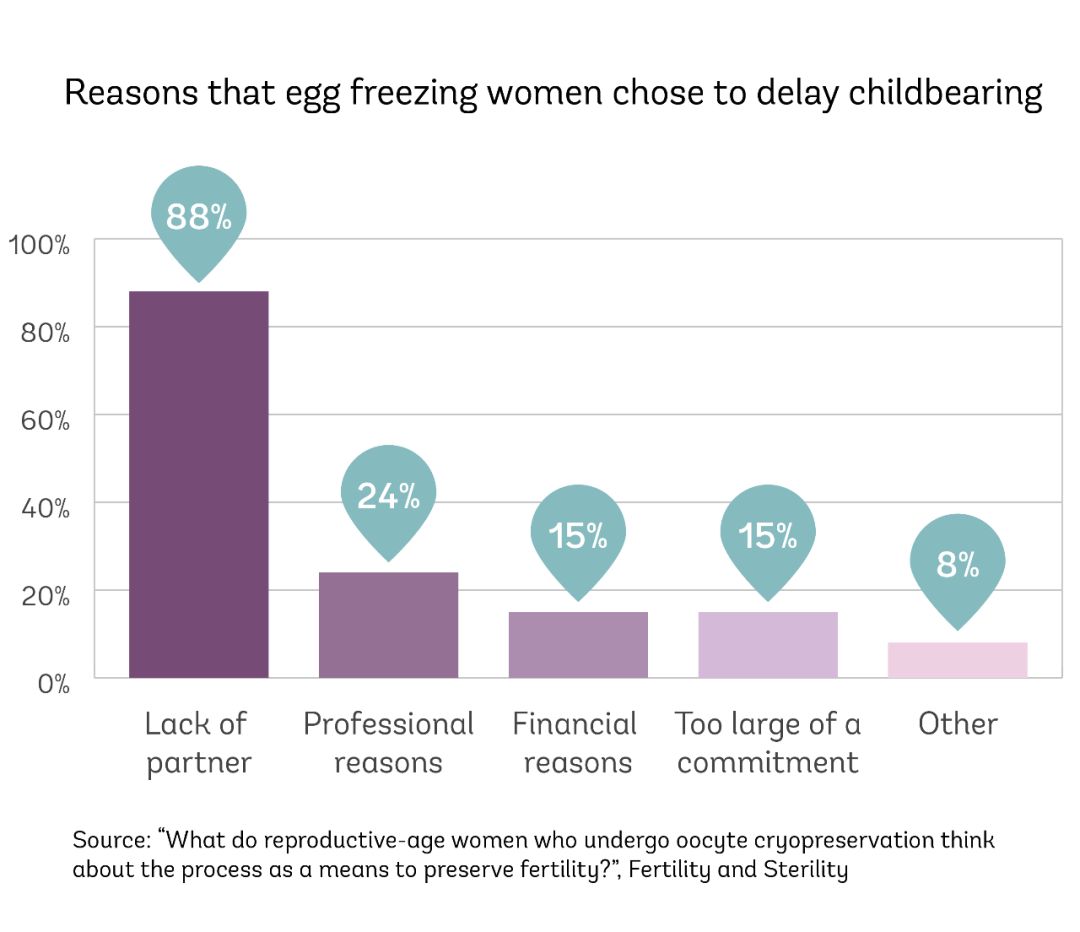 同时,英国莱斯特大学的研究发现,87%的女性在选择进行冻卵时并没有恋爱。这一理论也在耶鲁大学7月份发表的一项研究里出现,缺乏稳定的伴侣是女性选择冻卵的主要动机。