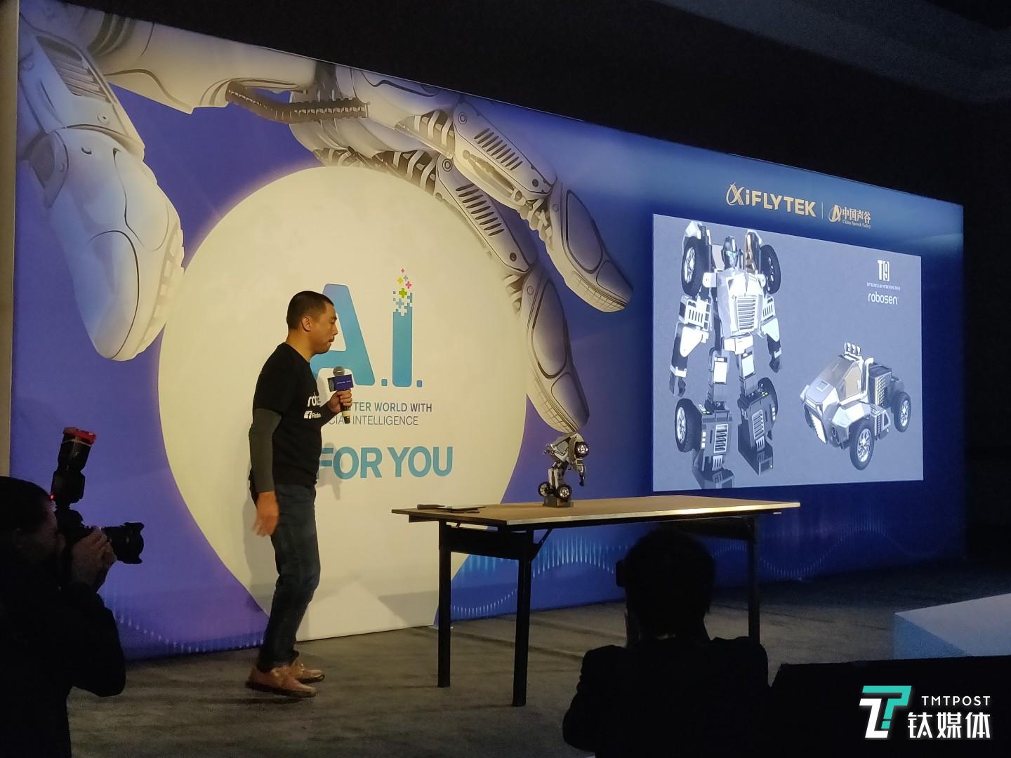 发布会上,科大讯飞还公布了语音交互系统iFLYOS最新进展,以及两个合作伙伴:咪鼠科技(MIMOUSE)和森汉科技(ROBOSEN),视频为深圳的机器人公司森汉科技(ROBOSEN)联合创始人苏国行展示变形机器人T9,可以做出跳舞、俯卧撑等动作。